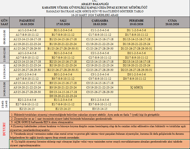 06.03.2026KARATEPE YÜKSEK GÜVENLİKLİ KAPALI CEZA İNFAZ KURUMU MÜDÜRLÜĞÜ RAMAZAN BAYRAMI GÖRÜŞ GÜN VE SAATLERİ